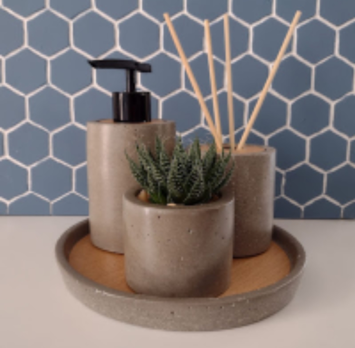 Peças artesanais feitas em concreto. A combinação do cimento com a madeira cria equilibrio e harmonia. Rusticidade e aconhego deixando o ambiente mais moderno.
