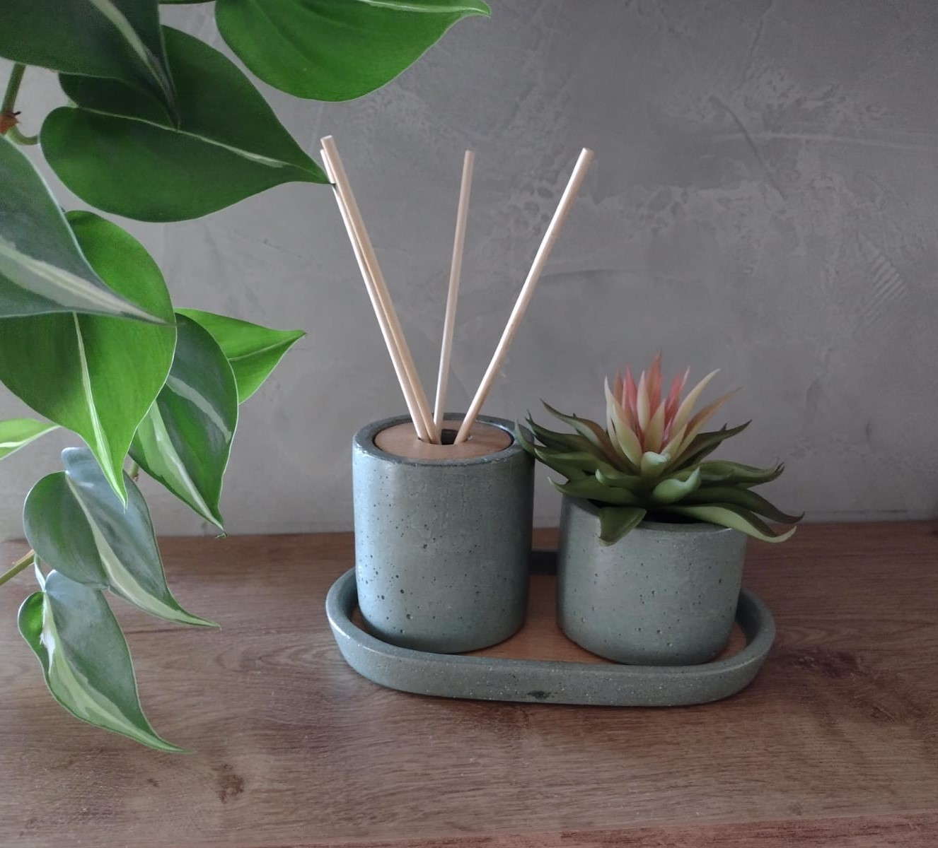 Peças artesanais feitas em concreto. A combinação perfeita do cimento colorido no tom verde e madeira, traz um toque moderno e aconchegante para qualquer ambiente.