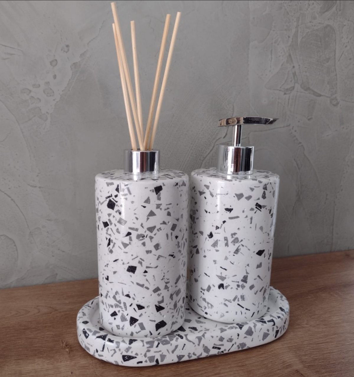 Peças artesanais feitas em cimento branco estrutural, utilizando a técnica granilite nas cores preto com cinza.
