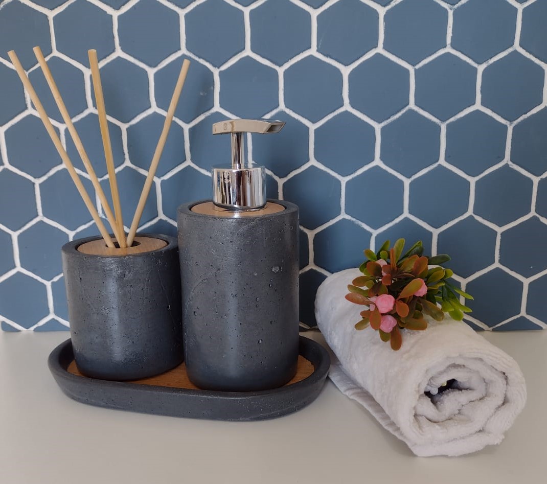 Peças artesanais feitas em concreto. A combinação perfeita do cimento colorido no tom azul e madeira, traz um toque moderno e aconchegante para qualquer ambiente.
